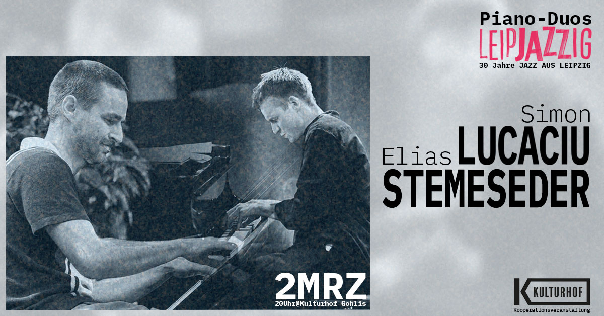 Kulturhof Gohlis Eisenacher Str. 72, Leipzig, Sachsen, GermanyPiano-Duo: Simon Lucaciu/Elias Stemeseder Kooperation mit dem Kulturhof Gohlis Wir nutzen die Gunst der Stunde: 2 Flügel stehen derzeit im Kulturhof Gohlis - darum veranstalten wir Piano-Duo-Konzerte! Zwei außergewöhnliche Pianisten, zwei Vertreter des europäischen Jazz, ein Abend voller musikalischer Entdeckungen: Der Leipziger Jazznachwuchspreis-Träger Simon Lucaciu trifft auf den in New York lebenden österreichischen […]