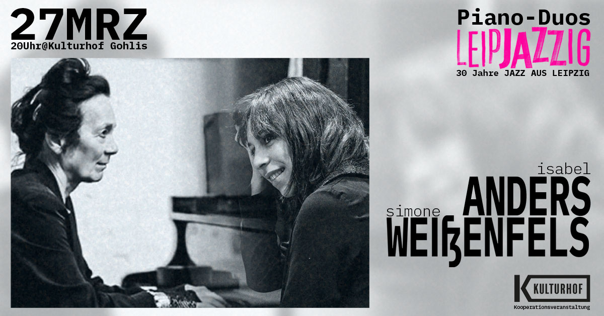 Kulturhof Gohlis Eisenacher Str. 72, Leipzig, Sachsen, GermanyPiano-Duo: Simone Weißenfels/Isabel Anders Kooperation mit dem Kulturhof Gohlis Wir nutzen die Gunst der Stunde: 2 Flügel stehen derzeit im Kulturhof Gohlis - darum veranstalten wir Piano-Duo-Konzerte! Wenn zwei Welten aufeinandertreffen: Simone Weißenfels, eine der prägenden Stimmen im Spannungsfeld von Klassik und Free-Jazz, bringt ihre jahrelange Erfahrung von internationalen Tourneen und bedeutenden Festivals […]